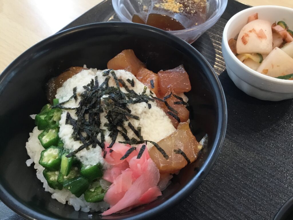 角切りに切ったマグロの漬けに長いもとオクラのねばねばコンビ!!ガリを添えて完成です。