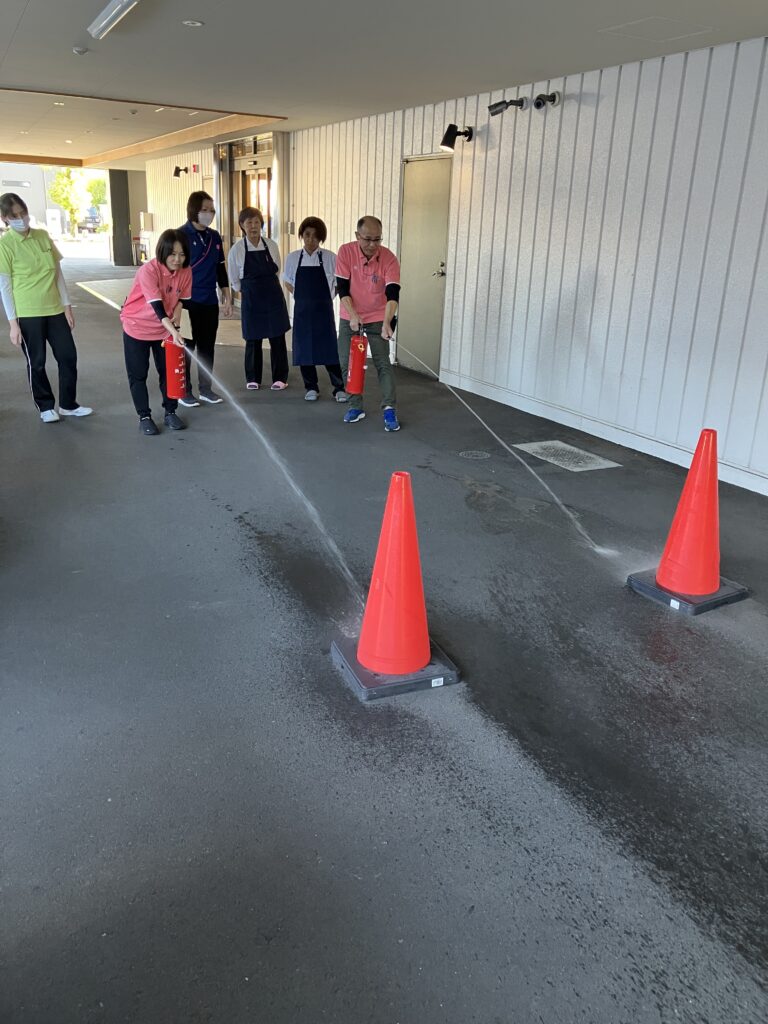 1階厨房で火災が発生した想定で駿河消防署への通報訓練、避難誘導訓練、水消火器により消火訓練を行いました。