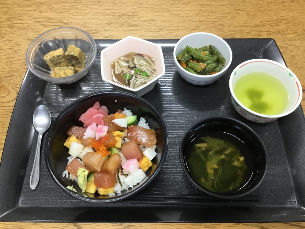 ・ バラちらし寿司(令和7年11月19日昼食メニュー) 2025年11月20日 最終更新日時 : 2025年11月20日 caritas-uto 本日は、まぐろ・イカ・玉子・トビコ・胡瓜をちらした「バラちらし寿司」😋 彩り鮮やかな盛り付けに食欲を刺激しますね!! デザートの「わらび餅」も手作りで好評でした👌 【メニュー内容】 メイン:バラちらし寿司 小鉢:冬瓜のうすくず煮/いんげんのピーナッツ和え お椀:すまし汁 デザート:わらび餅 \ 最新情報をチェック / FacebookXBlueskyHatenaCopy