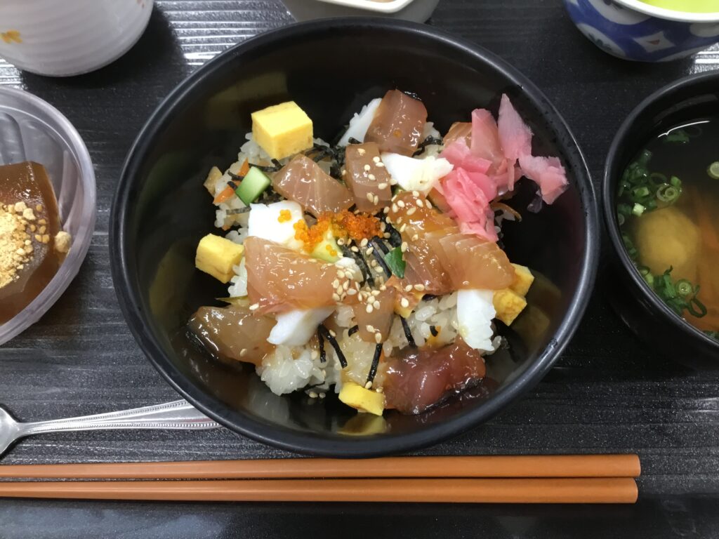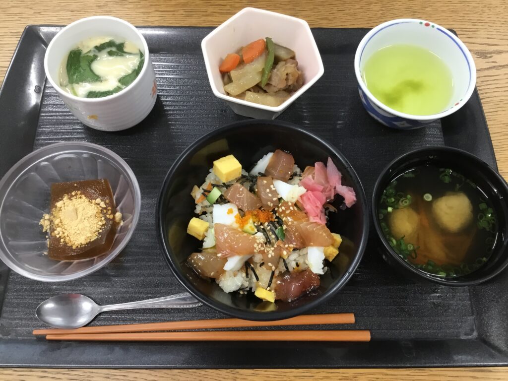 令和7年12月9日(火)本日の昼食メニューは3種セレクトではなく、特別メニューの五目ちらし寿司です。五目ごはんの上に、まぐろ、イカ、トビコ、玉子、キュウリを使ったちらし寿司!!頬っぺたが落ちました(^^♪