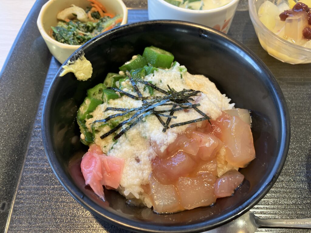 まぐろの醤油漬けにとろろとオクラを合わせたどんぶりです。