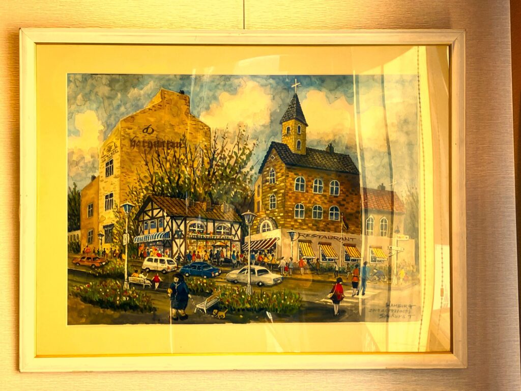 上の絵は、ドイツのハンブルグに行った時のもので、「空港から降りて広がる街並み」を描いた水彩画です。